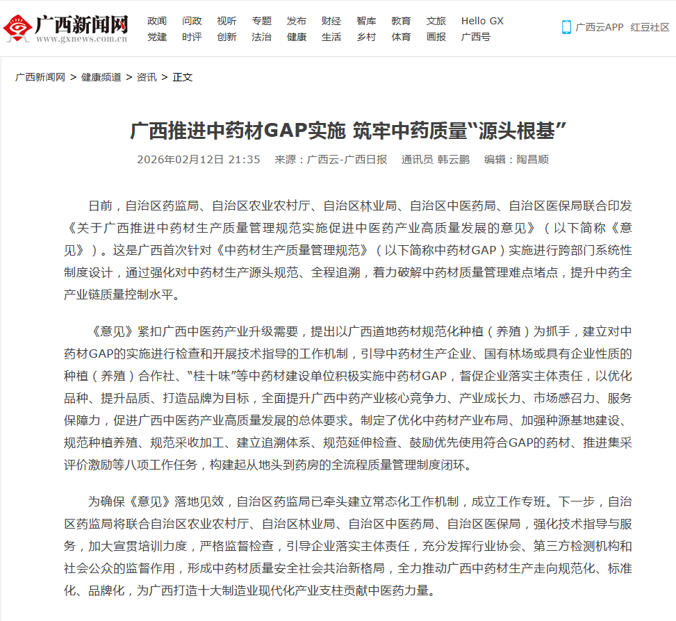 广西日报:广西推进中药材GAP实施 筑牢中药质量“源头根基”